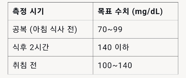 아래는 일반적인 혈당 측정 시기와 목표 수치입니다.