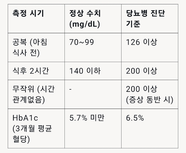 정상 혈당 수치는 건강한 사람과 당뇨병 환자에게 다르게 적용됩니다. 아래 표는 일반적인 정상 수치와 당뇨병 진단 기준을 정리한 것입니다.