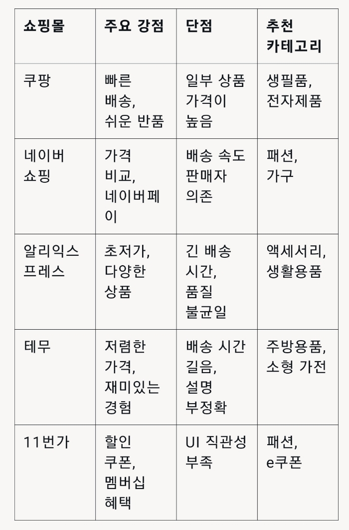 아래 표는 주요 온라인 쇼핑몰의 특징을 한눈에 정리한 것입니다.