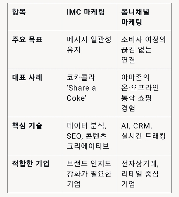 이 요소들은 각각 독립적이지만, IMC에서는 하나의 목표 아래 통합됩니다. 이를 통해 소비자는 어디서 브랜드를 만나든 동일한 가치를 느끼게 됩니다.
